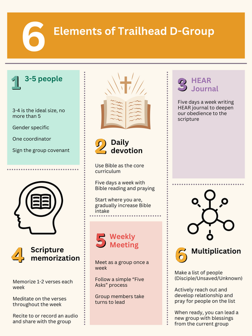 Learning from the best practitioners in the American church, Trailhead's D-group model resembles what Jesus did: spend more time with less people. It aims to create deeply connected relationship with high accountability for growth in Christ. It is a band of brothers with the end in mind," to be fruitful and multiply".